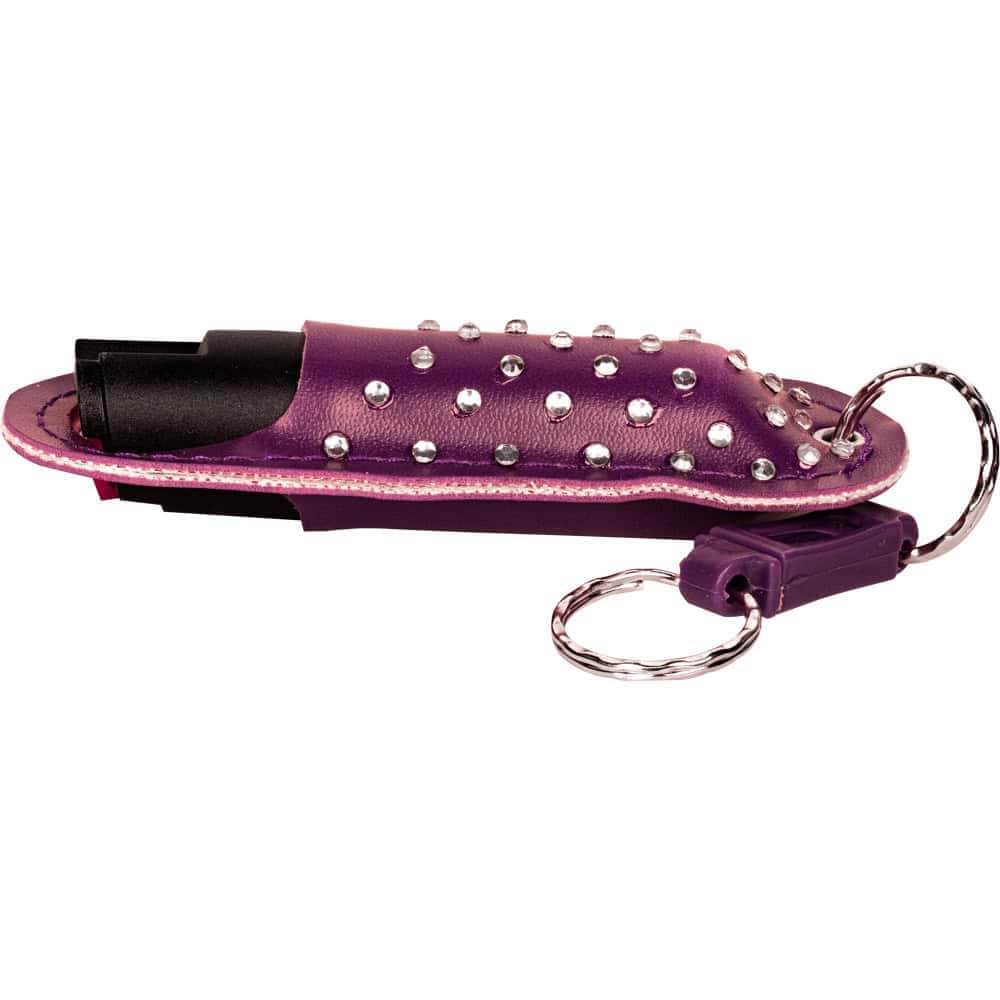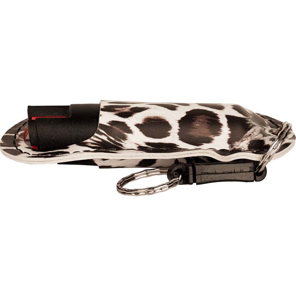 The Pepper Shot 1.2% MC ½ oz Pepper Spray Halo Holster. Features include Leatherette Case with Quick Release Keychain, UV Dye, 6-10 Bursts, 11 Colors & Patterns.