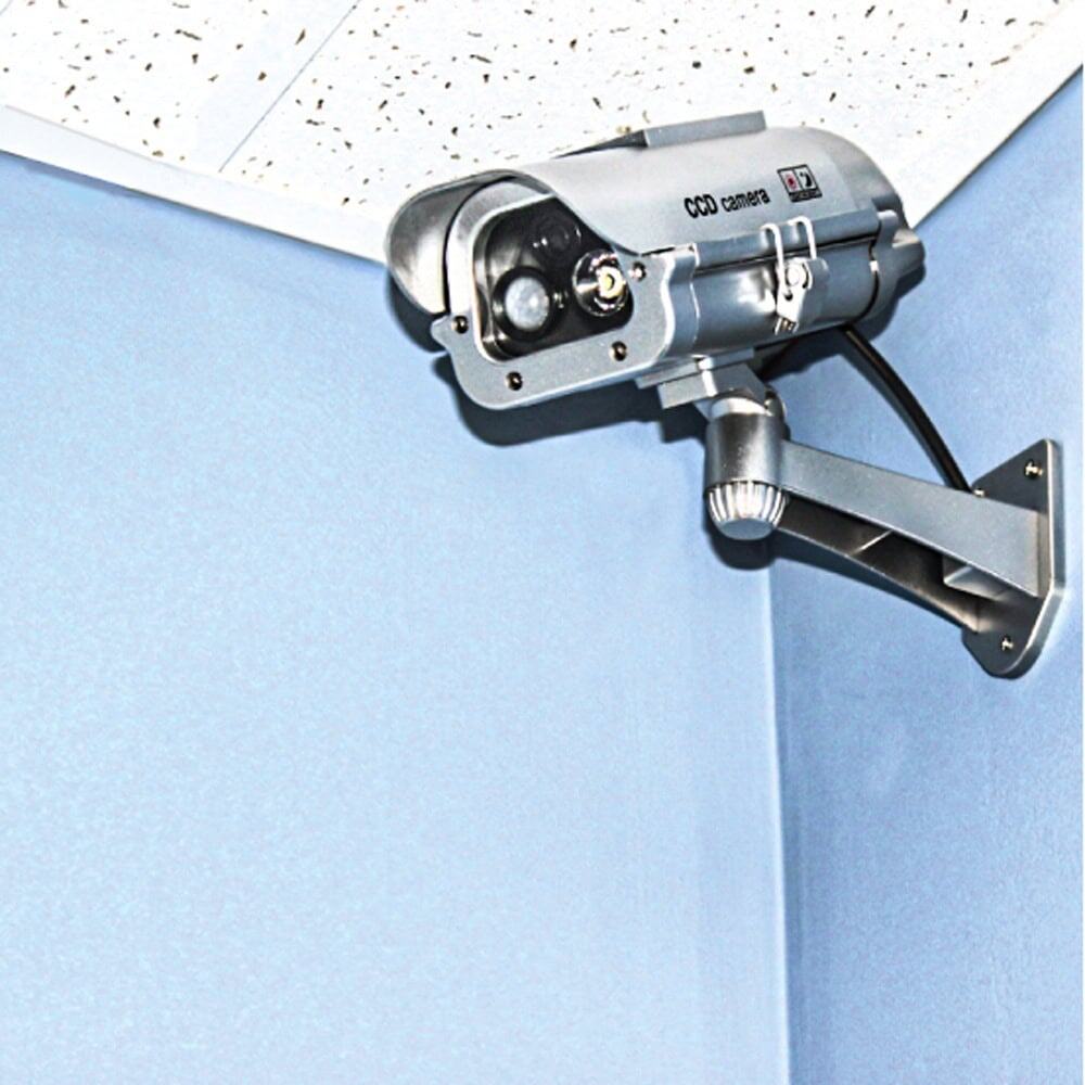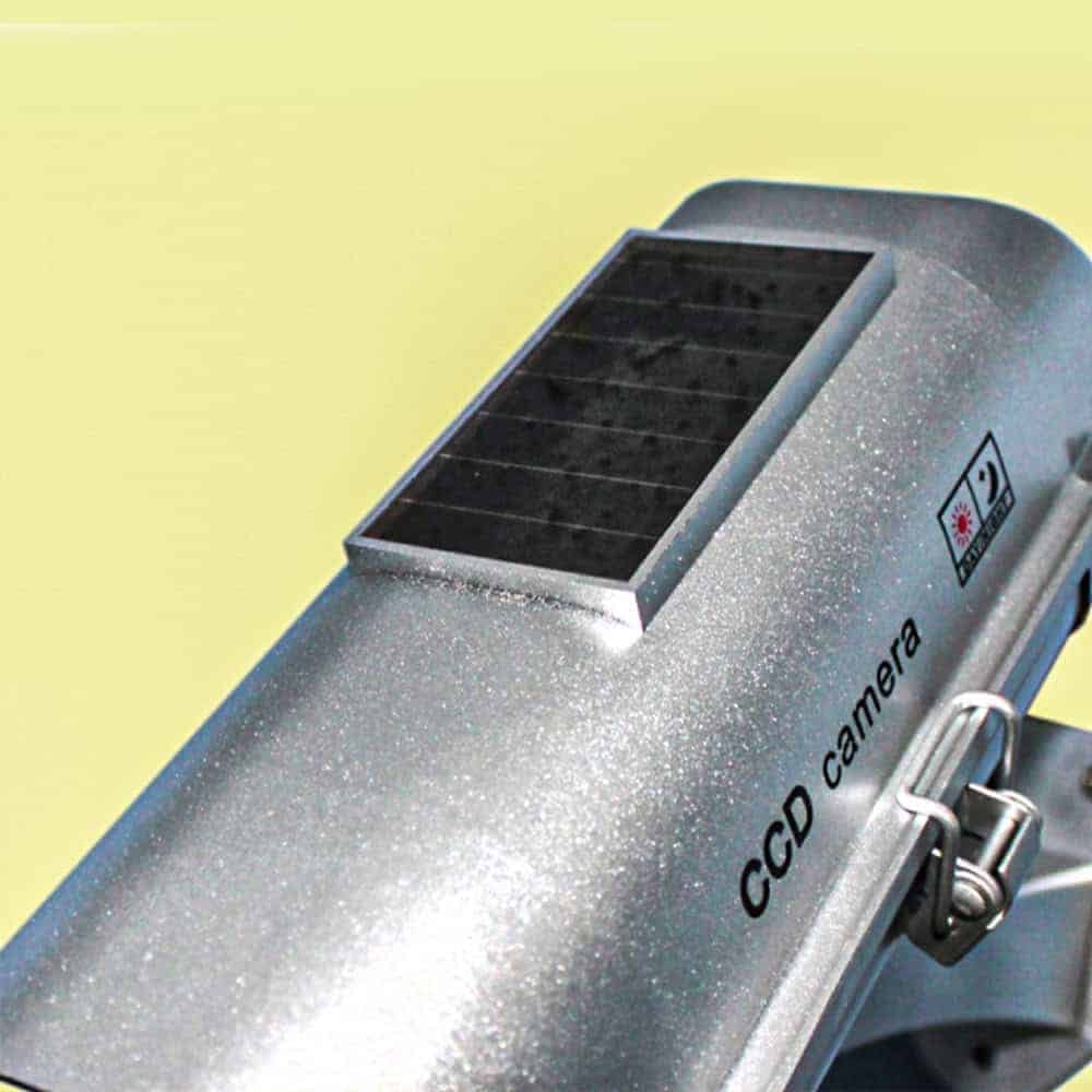 The dummy camera features a solar-powered motion-activated strobe light that will flash whenever motion is detected within a 15-foot range. The solar-powered LED light eliminates the cost of replacing batteries; if used outside the sun recharges the included rechargeable batteries. If you want to use this model indoors you can insert 3 AA batteries to provide direct power to the unit without any recharging. The dummy camera features a solar-powered motion-activated strobe light that will flash whenever motion is detected within a 15-foot range. The solar-powered LED light eliminates the cost of replacing batteries; if used outside the sun recharges the included rechargeable batteries. If you want to use this model indoors you can insert 3 AA batteries to provide direct power to the unit without any recharging.